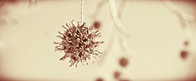 A spiky this or that hanging in a tree outside- Helios film lens + digital Rebel