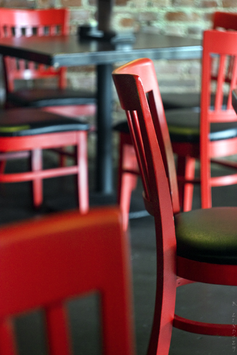 The colour scheme was rather masculine, which I very much like: red and black throughout surrounded by brick walls. Large pieces of machinery peppered the decor giving it an interesting industrial tinge that I very much dug: