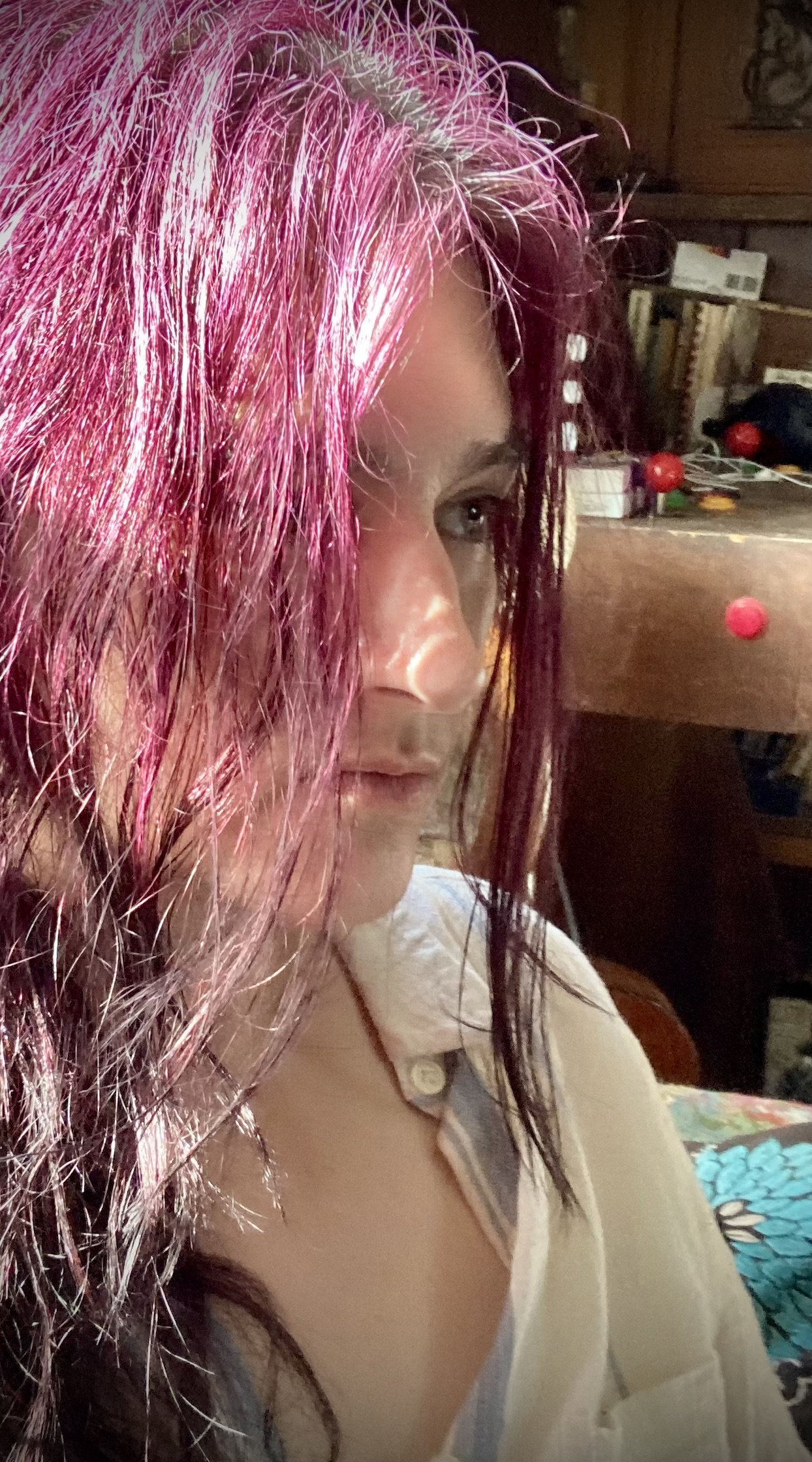 *Red robe tie to squeeze my migrainey head tight- check.