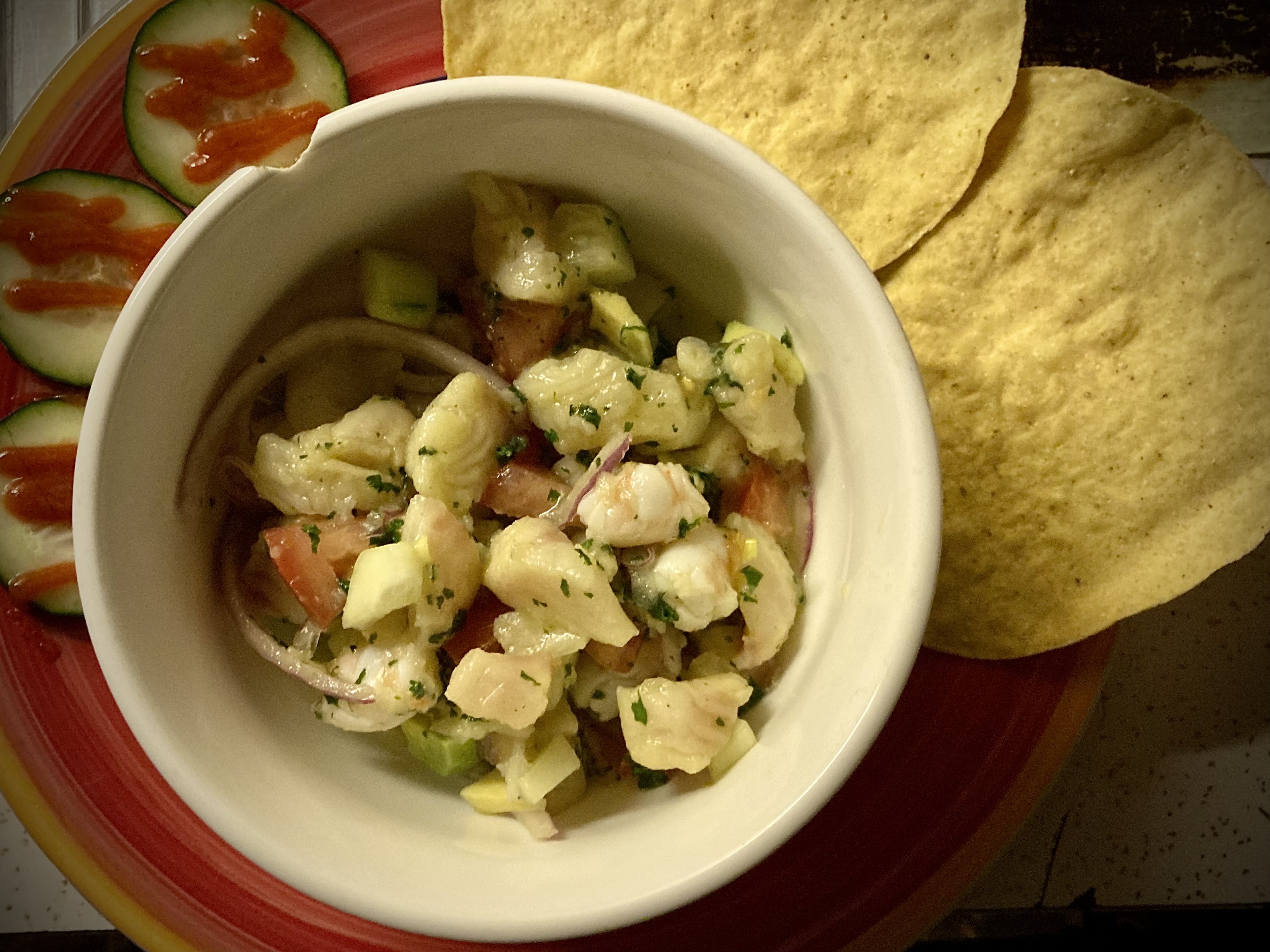 Homemade Tiger Shrimp & Tilapia Ceviche, marinated in lime, lemon, & OJ with red onions, garlic, vine-ripened tomatoes, raw honey, cucumbers, avocados, fresh cut cilantro & sea salt; + Sriracha cucumbers on the side w/ tostados, in a perfectly chipped bowl. My recipe. Iphone SE cellie. 1.20.22.