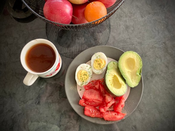 One hard-boiled egg, sliced tomato, and avocado with green tea- straight up.