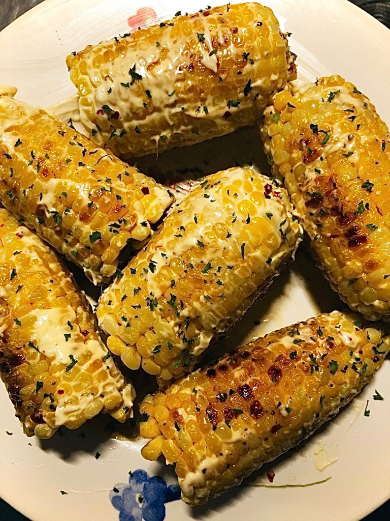 3 fresh ears of corn, Generous slathering of Mayonnaise, Olive Oil, Honey, Crushed Red Pepper, Parsley, Pink Himalayan Salt, Fresh Cracked Pepper.
