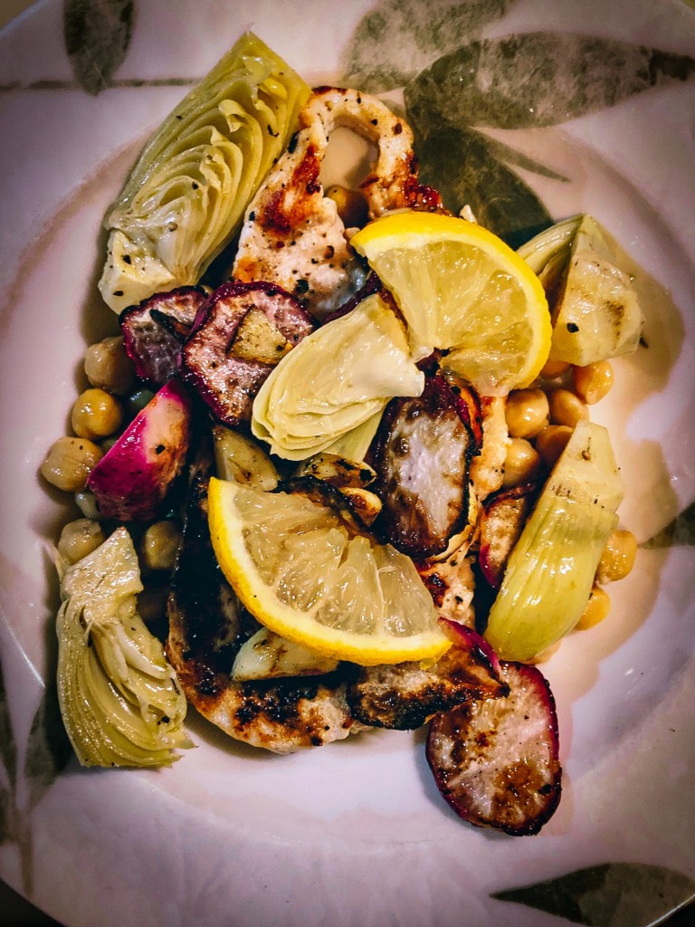 Blackened chicken, artichoke with radish and lemon on a bed of garbanzo beans.