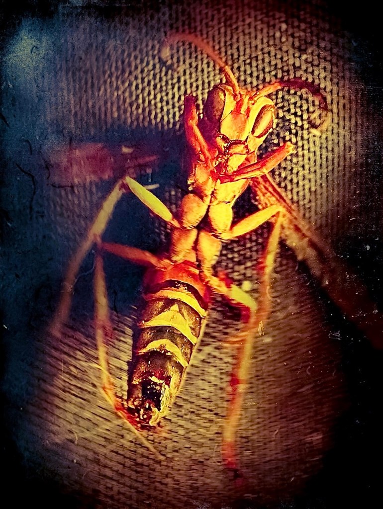 Wasp: Memorialized. Found yesterday, stuck to the bottom of a tea cup, bound by honey. I used a water-soaked Q-Tip and washed its body down and tried to rehydrate and revive it, to no avail, poor lad. Alas, he’ll live on visually.