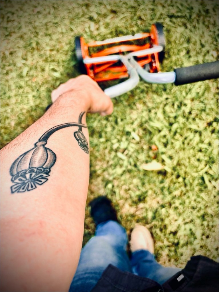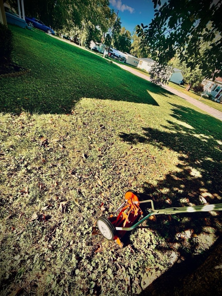 Yeah, I really am out here mowing one of my 3 separate yards on my broke-ass foot using my 1930’s era push mower. While fasting.